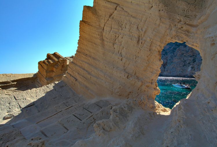 - © Krzysztof Wieprow / ShutterstockIl sud di Ibiza ospita alcuni tesori incomparabili, tra cui la misteriosa penisola diAtlantide. Partendo dal parcheggio vicino al belvedere di Es Vedrà, armatevi di coraggio per scendere il difficile e ripido sentiero che si snoda lungo le scogliere e le dune. Ma ne vale la pena, perché si raggiunge uno dei luoghi più incantevoli di tutta Ibiza! La strana formazione rocciosa bianca di Atlantide, che si tuffa nell'acqua cobalto, ha dato origine a ogni sorta di mito legato in particolare alla perduta Città di Atlantide. In realtà si tratta di un'antica cava, il che spiega le linee oblique tracciate dalla roccia.